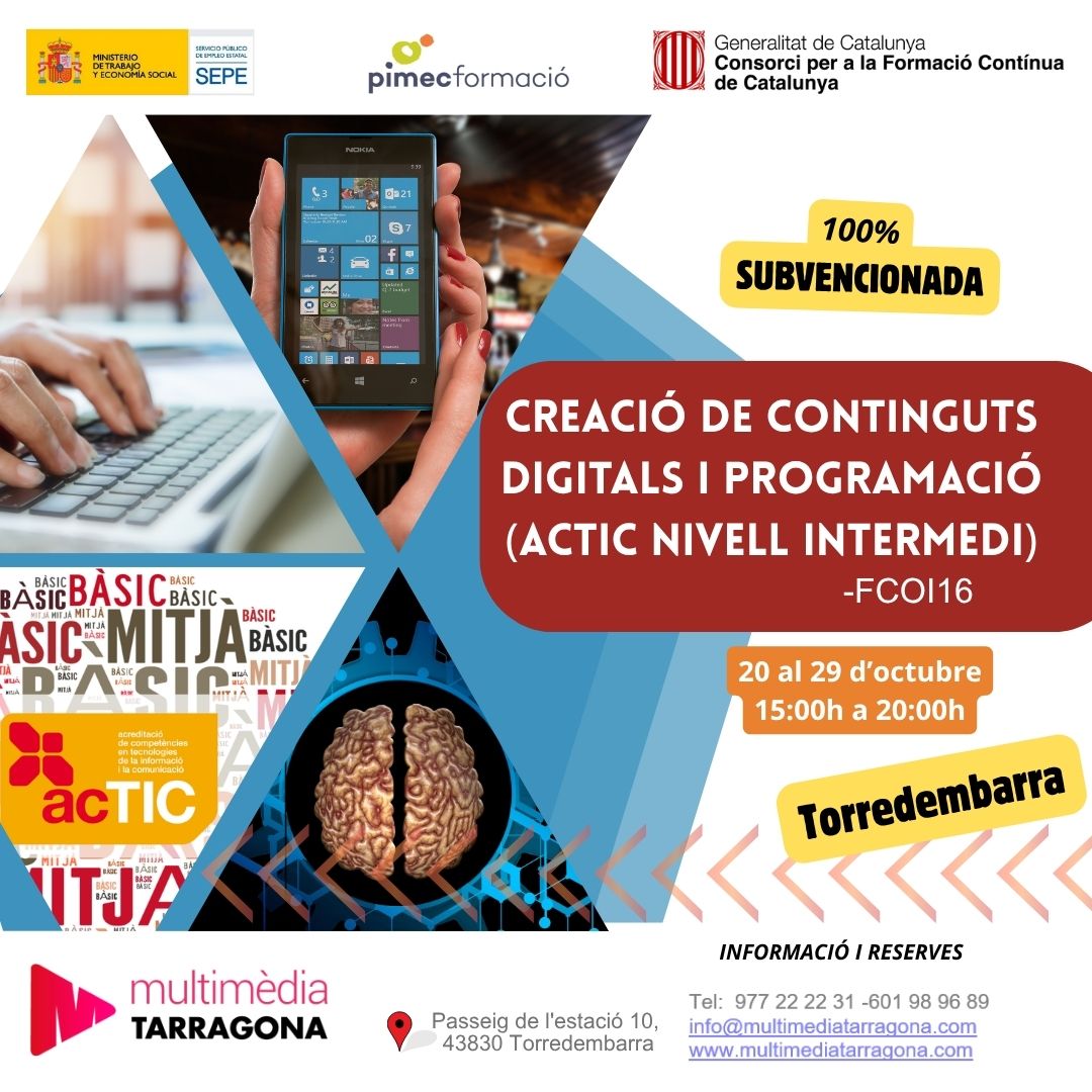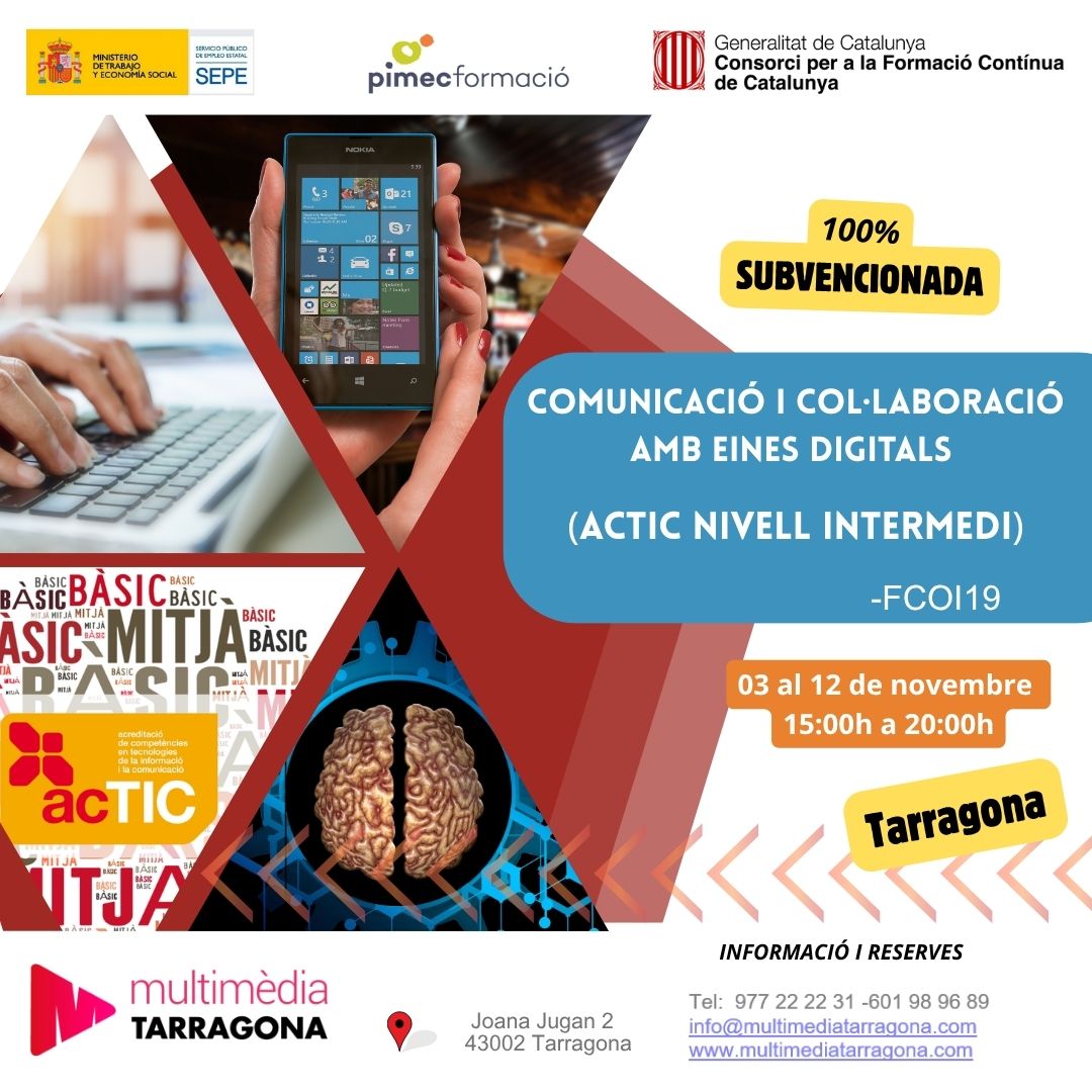 Multimèdia Tarragona és una empresa amb més de 20 anys d’experiència en el sector de la formació de les TIC. El nostre principal objectiu és proporcionar eines i recursos de qualitat segons les necessitats dels nostres usuaris. Oferim serveis formatius a empreses i particulars, formació presencial y online ( aula virtual). Impartim formació en àmbits diversos des de la informàtica, gestió empresarial, comunicació… Tota aquesta informació la podeu trobar a la secció Formació.